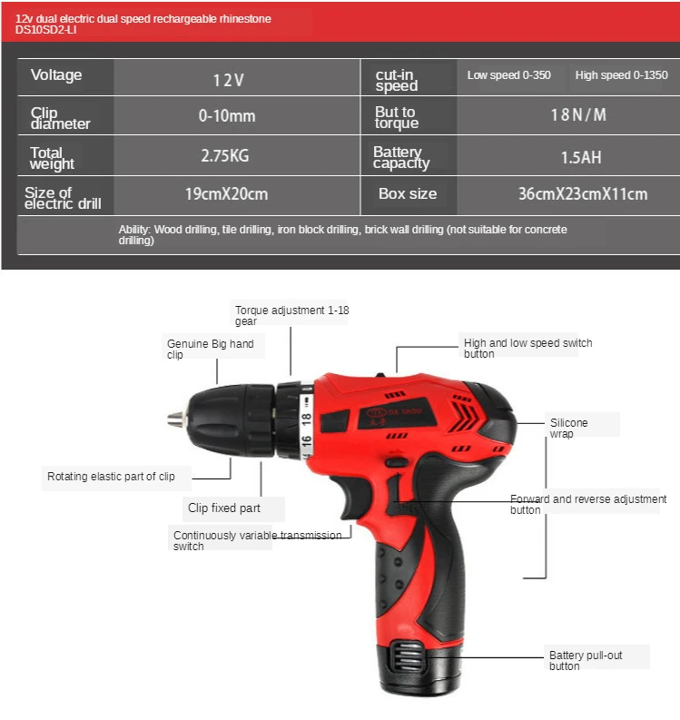 Product Name: Lithium Screwdriver 12V Rechargeable Two-speed Self-locking Electric Screwdriver Electric Drill